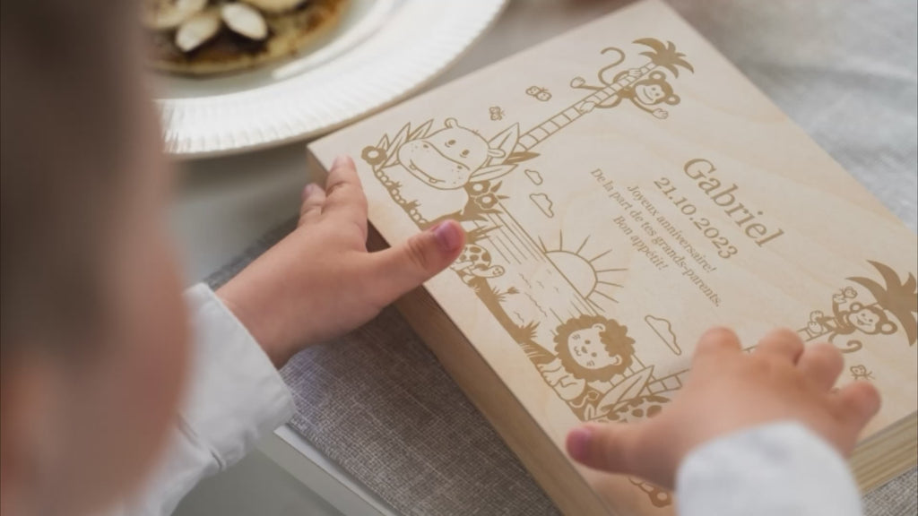 Le set couvert bébé est livré dans une boîte en bois personnalisée avec un joli motif de jungle, qui est fabriquée en vrai bois tendre et qui convient parfaitement comme cadeau naissance personnalisé de haute qualité pour les couverts. Dotée d'un fermoir en métal et d'un couvercle à charnière, la petite boîte en bois est fabriquée en bois massif.