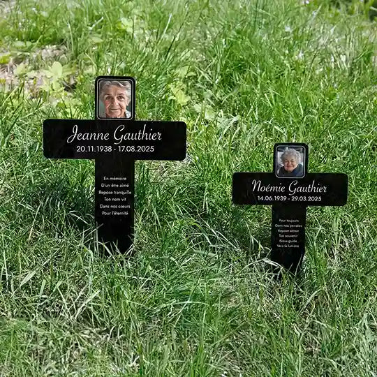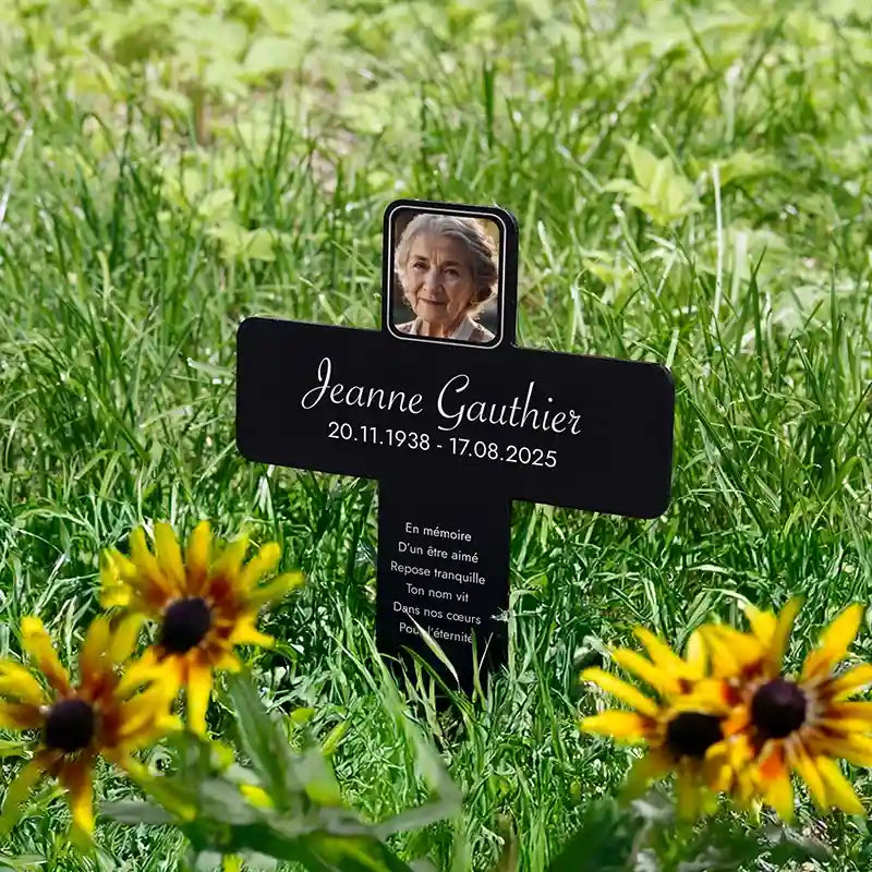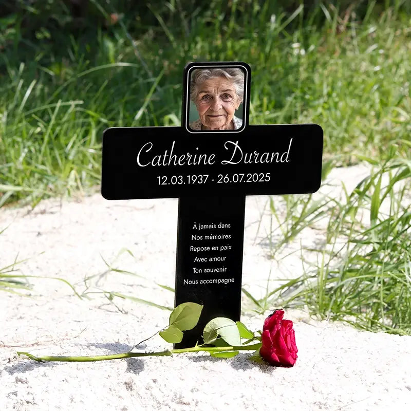 Notre croix funéraire personnalisée avec nom et photo est bien plus qu’une simple décoration de tombe – c’est un souvenir chargé d’émotion, qui capture les moments et les sentiments partagés avec la personne aimée. Fabriquée en acrylique de haute qualité, cette croix résistante aux intempéries est imprimée selon vos souhaits : nom, photo, dates de vie et message personnel. Cette personnalisation rend chaque croix unique et transforme la douleur de la perte en un hommage empreint de tendresse et de respect.