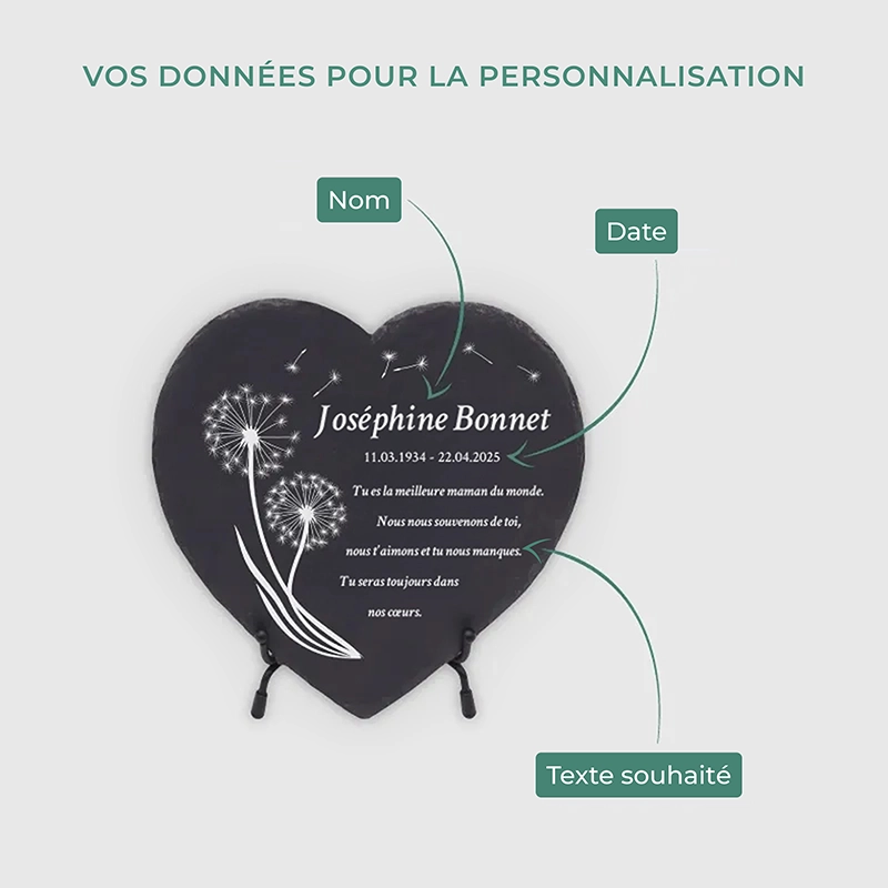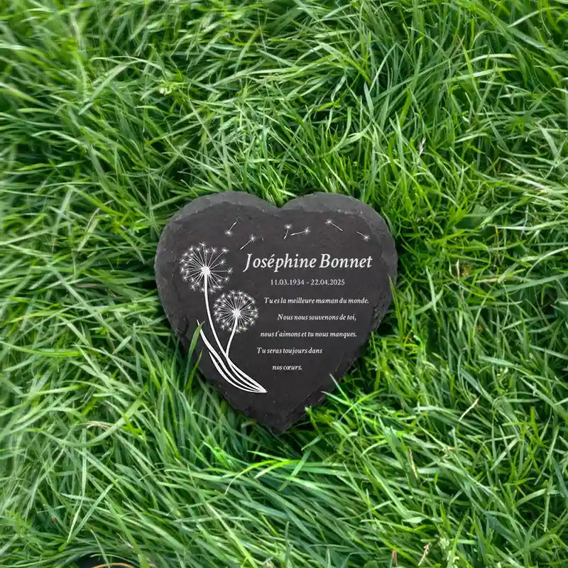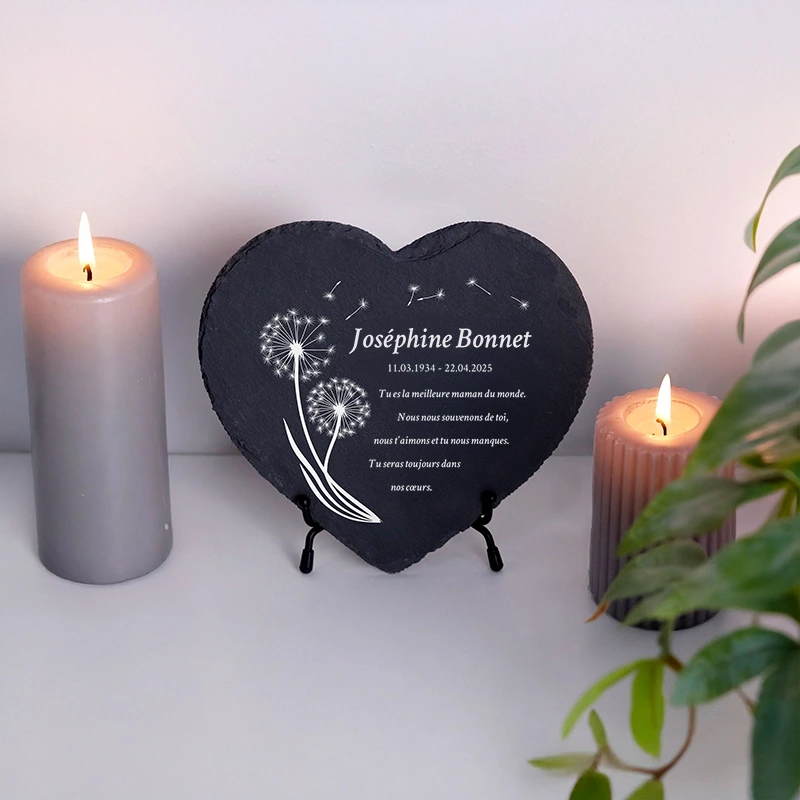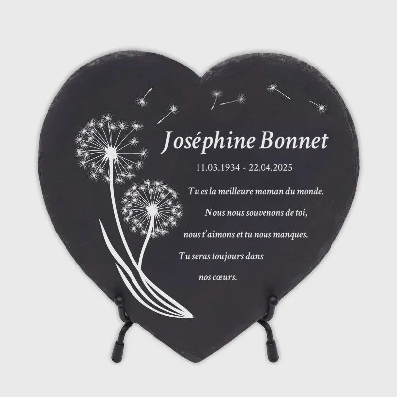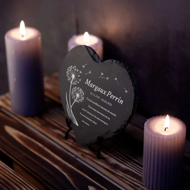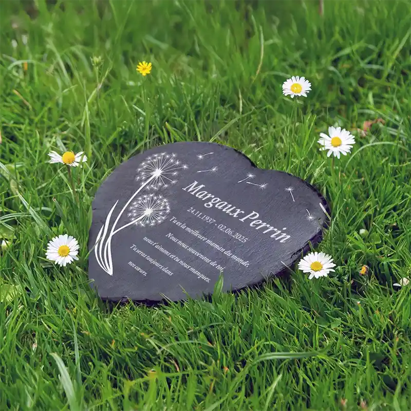 Les plaques en ardoise gravées de pissenlit pour les tombes d'urnes sont des souvenirs personnalisés de haute qualité. Chaque décoration tombale en forme de cœur peut être conçue individuellement – avec le nom, les dates et le texte personnalisé. Ces options de personnalisation vous permettent de créer une plaque en ardoise qui reflète la personnalité et la vie de votre être cher.