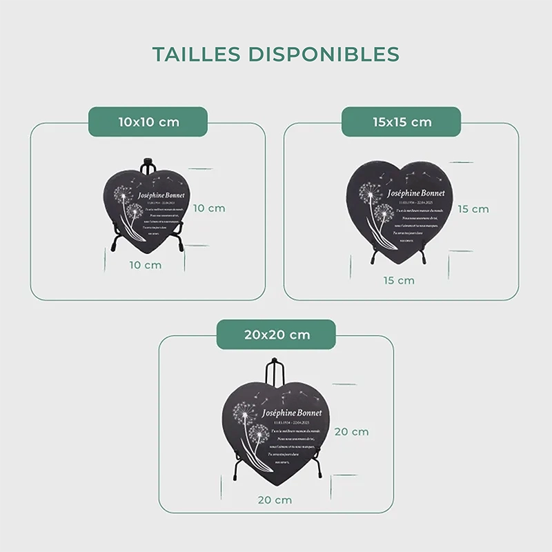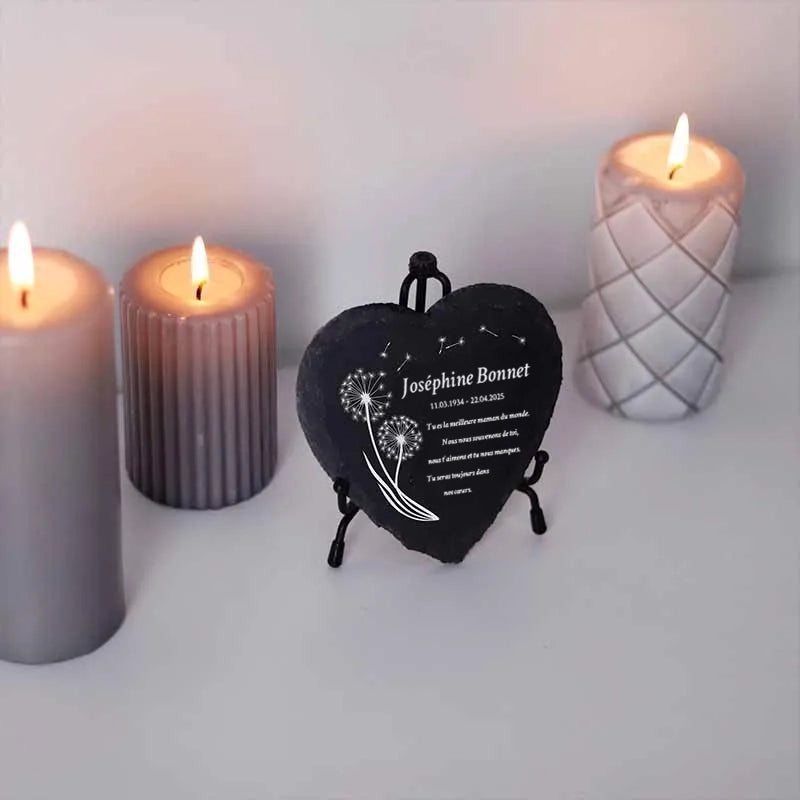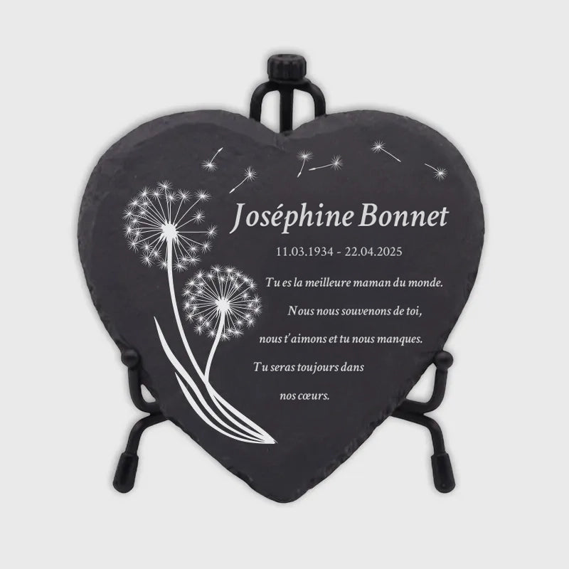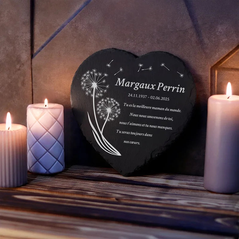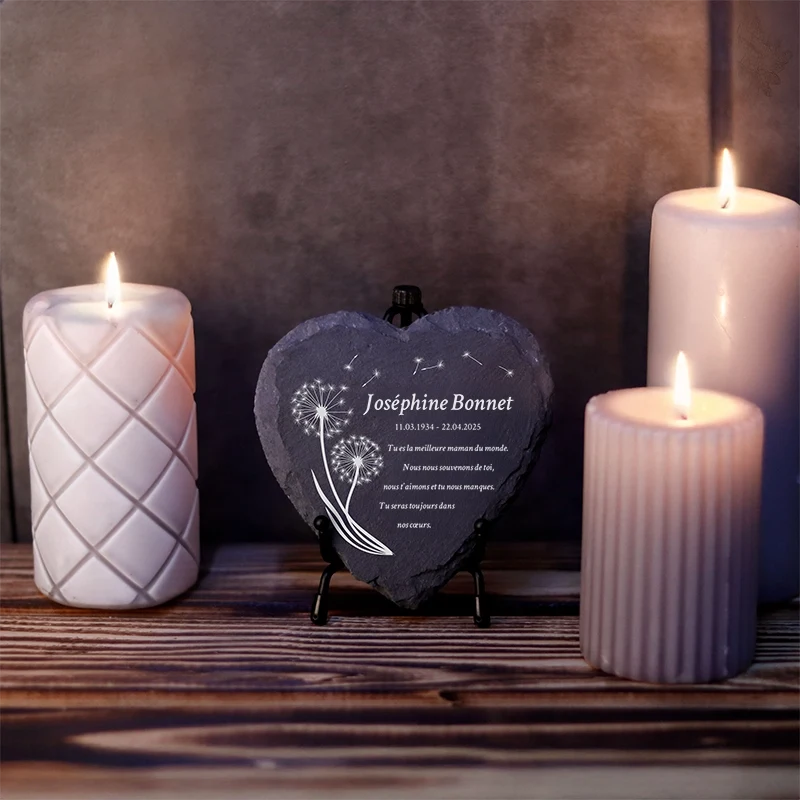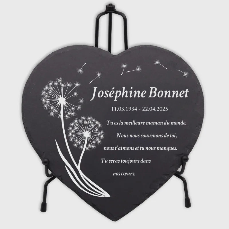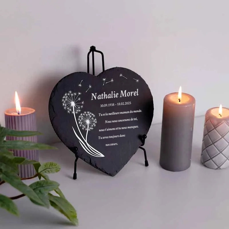 Les plaques en ardoise gravées de pissenlit pour les tombes d'urnes sont des souvenirs personnalisés de haute qualité. Chaque décoration tombale en forme de cœur peut être conçue individuellement – avec le nom, les dates et le texte personnalisé. Ces options de personnalisation vous permettent de créer une plaque en ardoise qui reflète la personnalité et la vie de votre être cher.