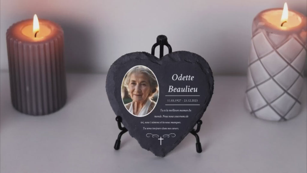 Une pierre funéraire personnalisée en forme de cœur est une expression d'amour, de respect et d'adieu. La combinaison de l'ardoise de haute qualité et de l'impression UV moderne rend chaque plaque unique et durable, en faisant un souvenir mémorable et résistant au temps.