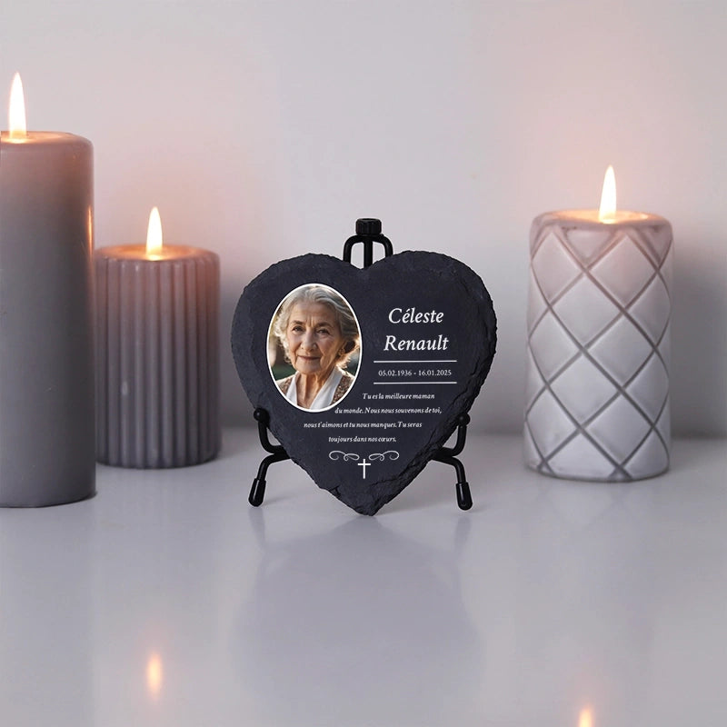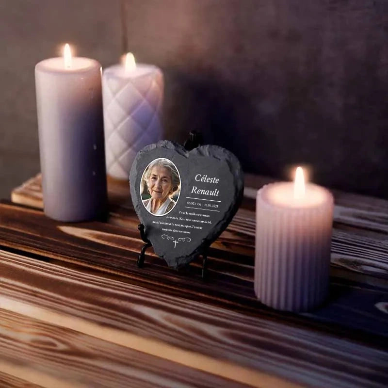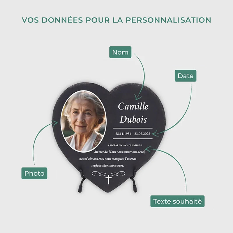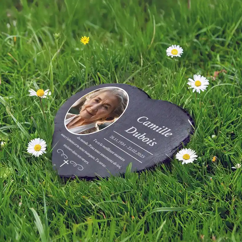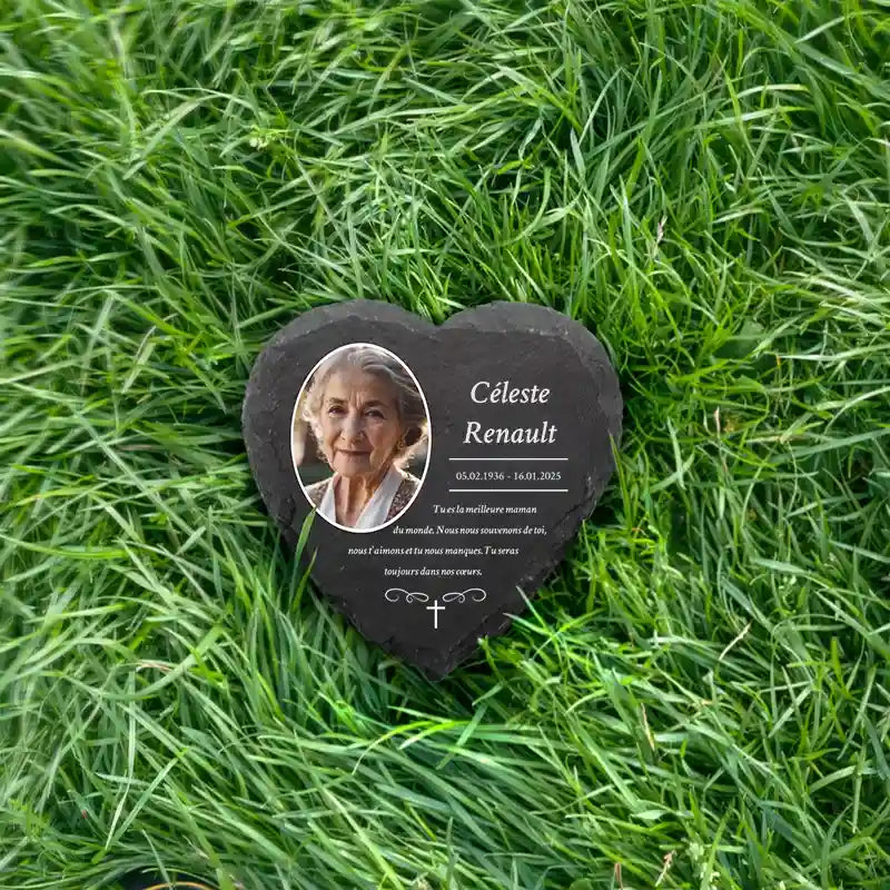 Une pierre funéraire personnalisée en forme de cœur est une expression d'amour, de respect et d'adieu. La combinaison de l'ardoise de haute qualité et de l'impression UV moderne rend chaque plaque unique et durable, en faisant un souvenir mémorable et résistant au temps.