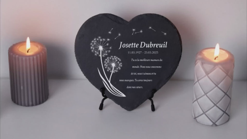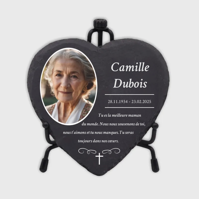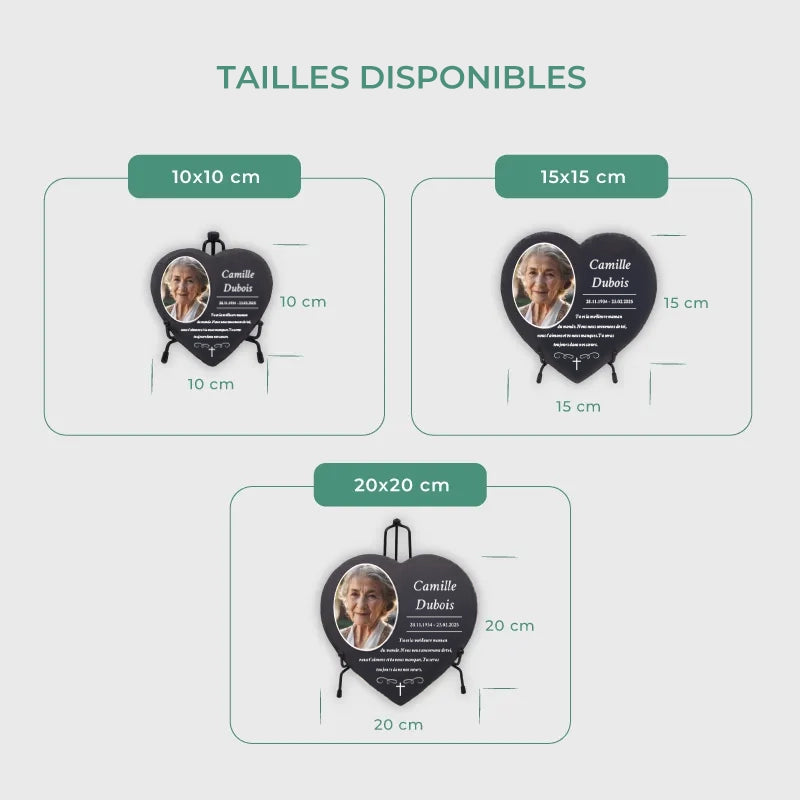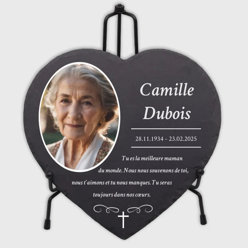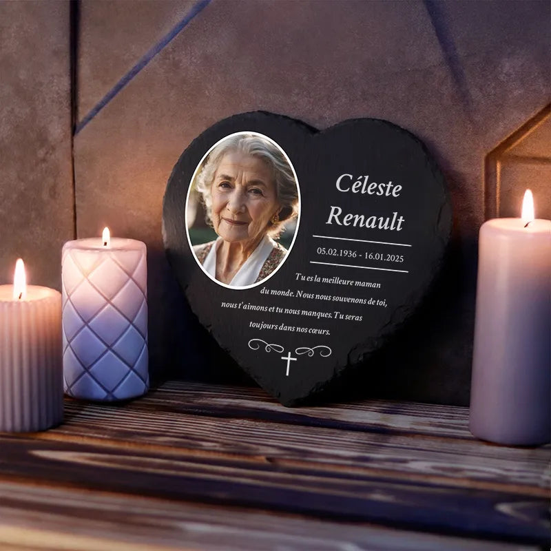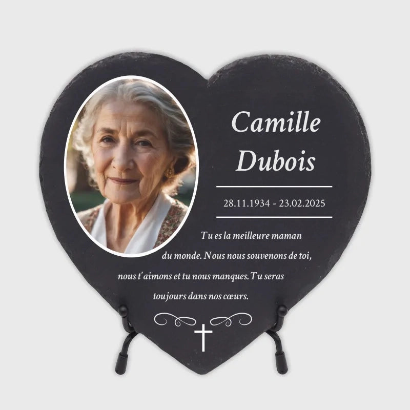 Une pierre funéraire personnalisée en forme de cœur est une expression d'amour, de respect et d'adieu. La combinaison de l'ardoise de haute qualité et de l'impression UV moderne rend chaque plaque unique et durable, en faisant un souvenir mémorable et résistant au temps.