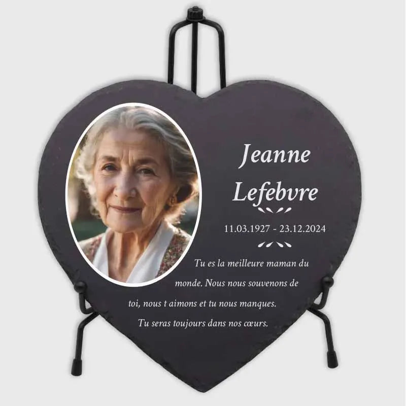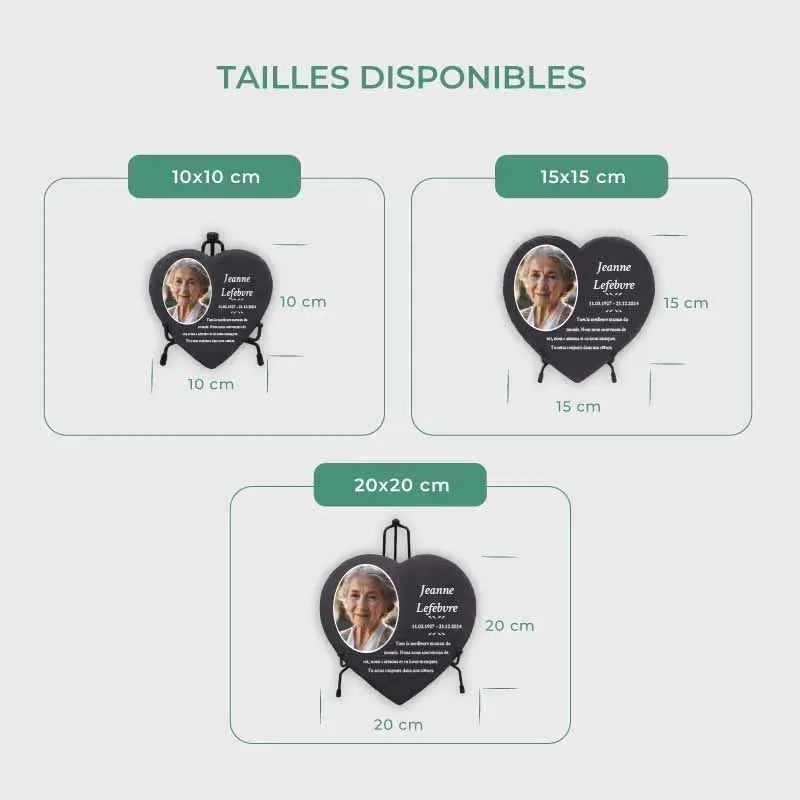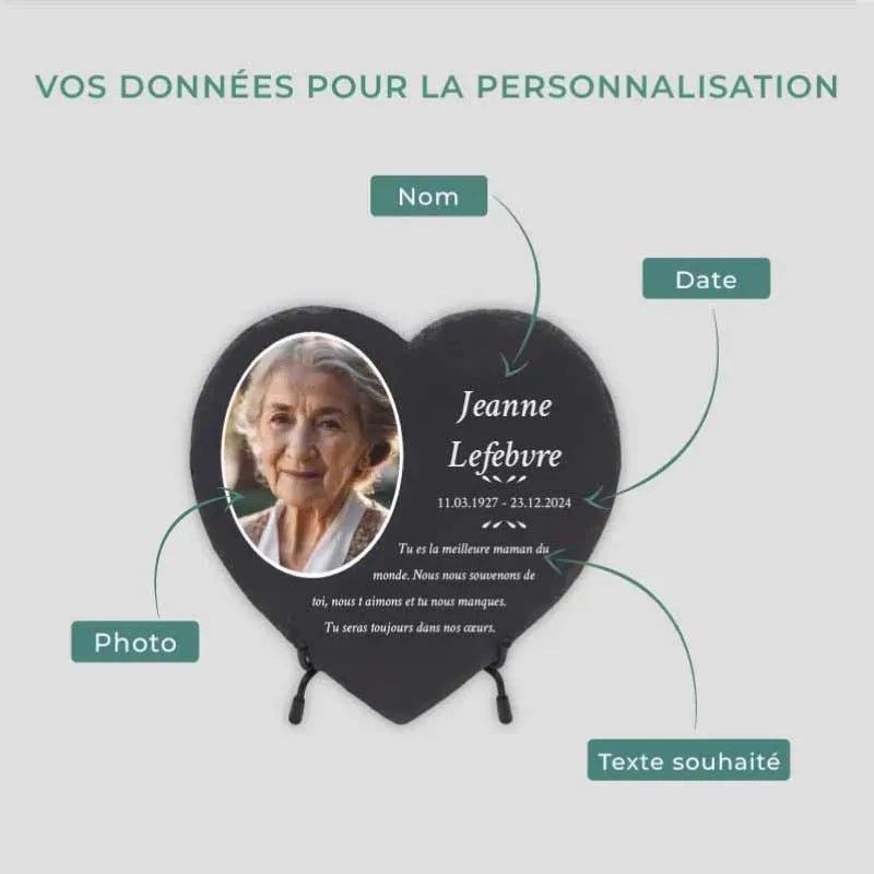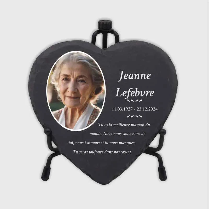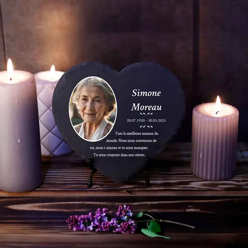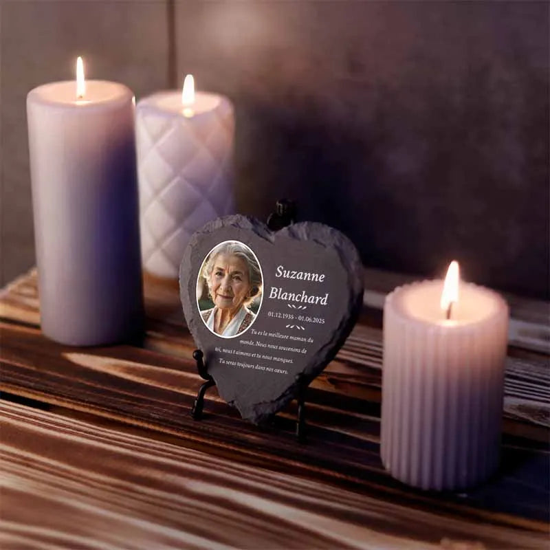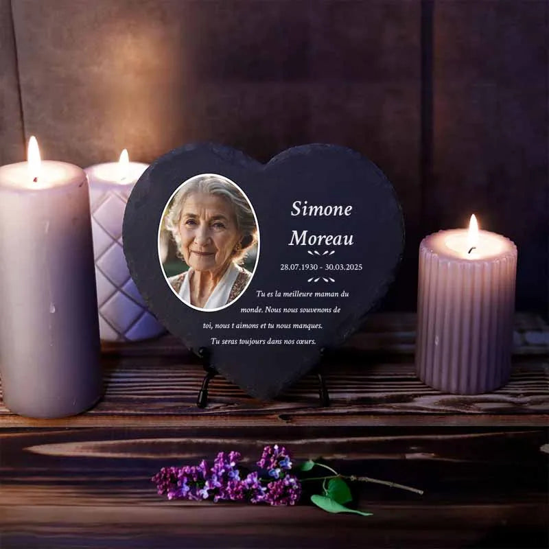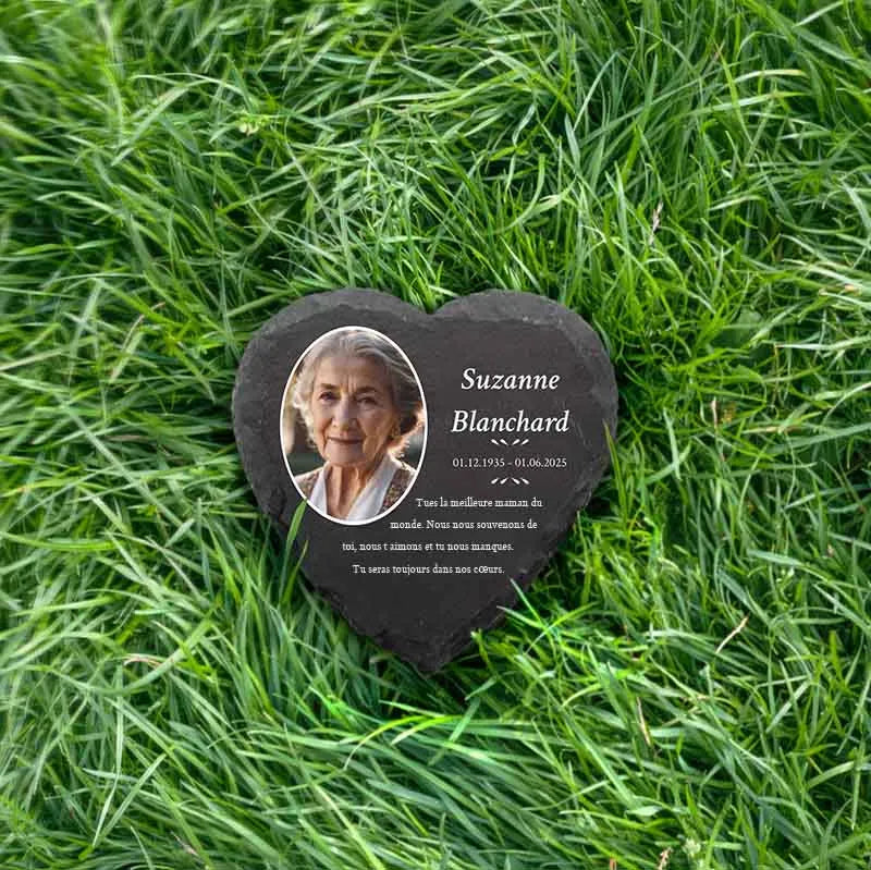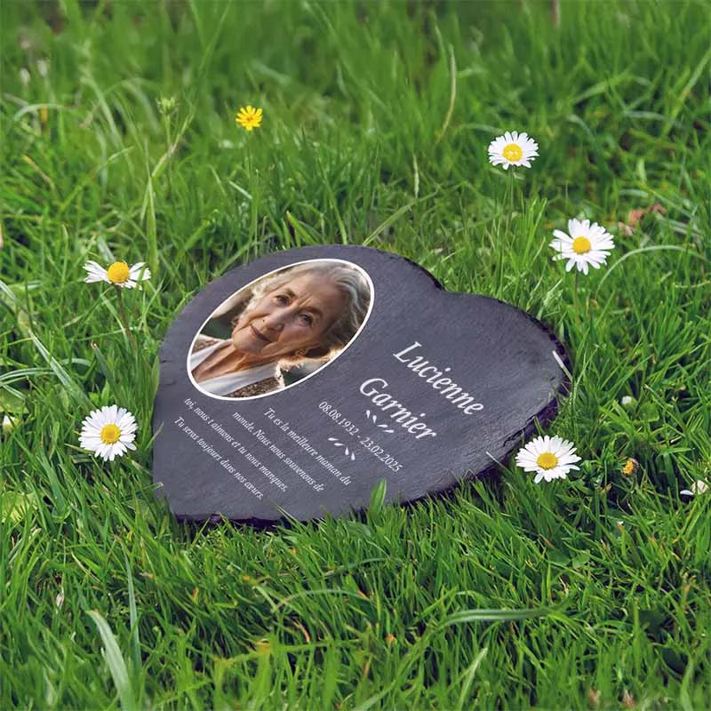 Une pierre funéraire personnalisée en forme de cœur est une expression d'amour, de respect et d'adieu. La combinaison de l'ardoise de haute qualité et de l'impression UV moderne rend chaque plaque unique et durable, en faisant un souvenir mémorable et résistant au temps.