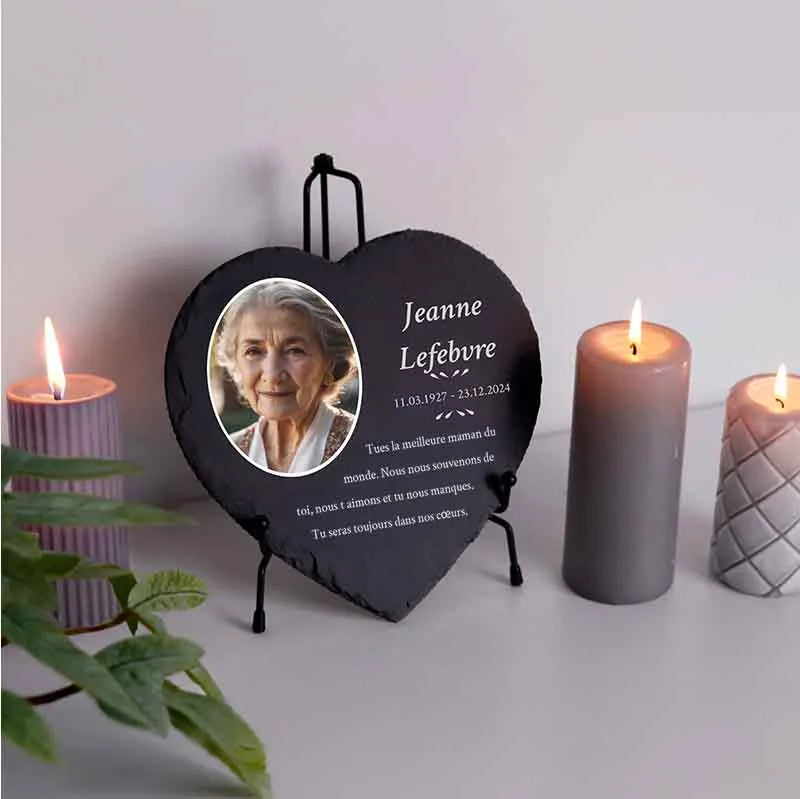 Les ornements tombales et les pierres commemoratives sont des souvenirs personnalisés de haute qualité. Chaque plaque en ardoise gravée peut être conçue individuellement – avec le nom, les dates, la photo et le texte personnalisé. Ces options de personnalisation vous permettent de créer une plaque en ardoise qui reflète la personnalité et la vie de votre être cher.