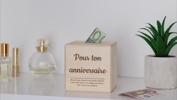 La tirelire personnalisée est un cadeau réfléchi et pratique pour toute occasion. Que ce soit comme outil motivant pour l'épargne ou simplement comme décoration élégante, le coffret à économies est un cadeau parfait pour les amis, la famille ou les collègues. Obtenez dès aujourd'hui votre tirelire avec impression.